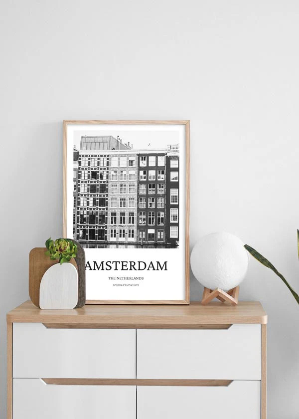 Cuadro fotográfico de la ciudad de Ámsterdam en blanco y negro. Si esta es tu ciudad preferida, te ha marcado hondo en algún viaje, o simplemente te encanta su cultura, ¡debe de estar en tu hogar!.