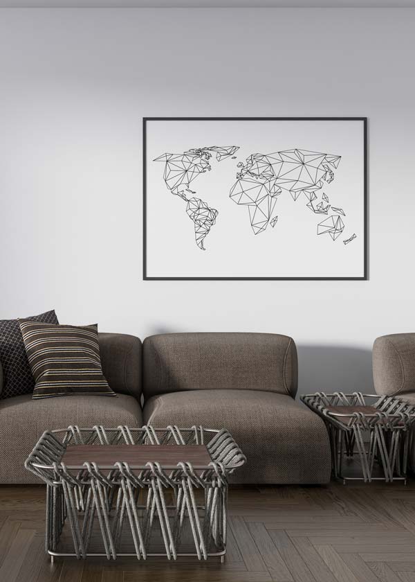 Cuadro de Mapa del Mundo en blanco y negro y estilo geométrico. Esta lámina decorativa horizontal tiene que ser tuya si eres amante del viaje y el descubrimiento. Recórrete este mapamundi, y colgando esta obra en tus paredes lo recordarás cada día.